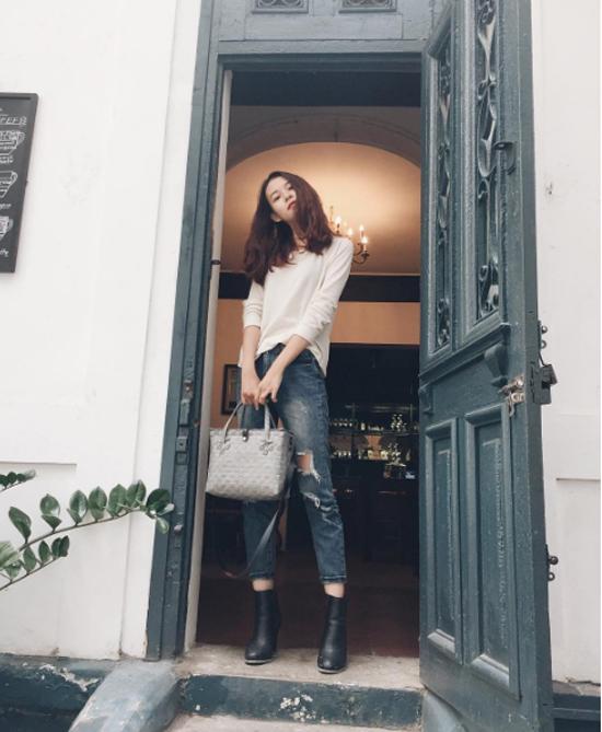 Quần jeans rách được cô sử dụng thường xuyên ở đời thường.