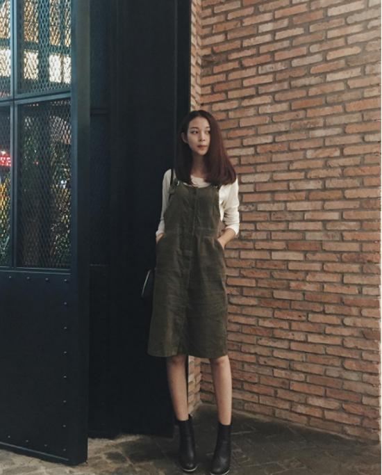 Váy yếm là item phải có của một cô nàng sành điệu trong mọi mùa. Những ngày đầu thu, bạn có thể bắt chước phong cách thời thượng cùng váy yếm, áo phông dài tay và ankle boots như Phí Phương Anh.