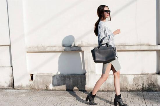 Đôi khi, cô lại hóa quý cô công sở với chân váy xẻ, áo dài tay và ankle boots. Chiếc túi đen xách tay là điểm nhấn cho toàn bộ set đồ.