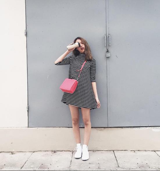 Thoải mái, hiện đại đó chính là cách lựa chọn váy kẻ sọc dáng suông, giày sneaker trắng và túi đeo chéo màu đỏ như Quán quân The Face mùa đầu tiên.