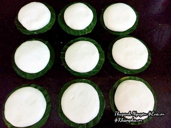 Cắt lá chuối thành hình tròn tùy ý, phết dầu ăn để khỏi dính rồi viên bột đặt lên trên, dùng tay ấn dẹt bột rồi cho vào xửng hấp.