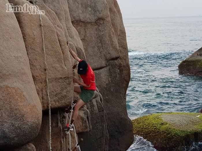 Thử thách lớn nhất là mọi người phải leo từ trên một tảng đá cao xuống, nhìn mà mình cũng thấy hơi lo. Vách đá cao dựng đứng, chỉ có mấy cọng dây của những người đi trước bỏ lại, phía dưới lại là ghềnh đá sóng đập rất mạnh. Nhưng cũng may vì có dây được thiết lập sẵn giúp cho tụi mình vượt qua thử thách này dễ dàng hơn.