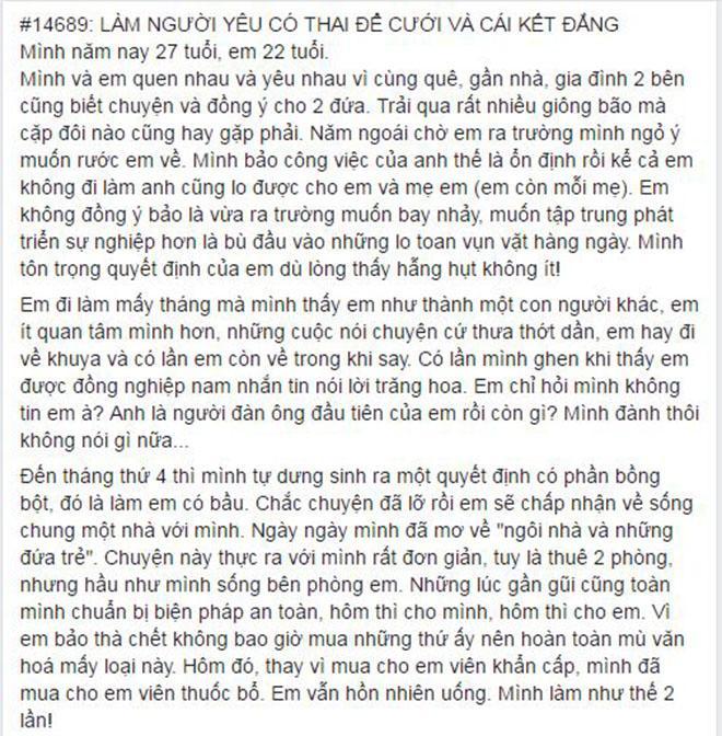"Hôm đi với anh ấy, anh ấy và em uống say, sau đó bọn em không làm chủ được mình. Sau đó em rất sợ, nhưng em tính thì vào ngày an toàn nên lại thôi. Bọn mình thì trước giờ đều cẩn thận nên đứa bé này chắc do ông trời sắp đặt. Em không giết con em đâu. Em cũng không thể để nó không có bố anh à. Em xin lỗi anh, em đã nói chuyện với anh D rồi, a ấy bảo sang tháng làm đám cưới, em xin lỗi anh, mình chia tay thôi anh..."