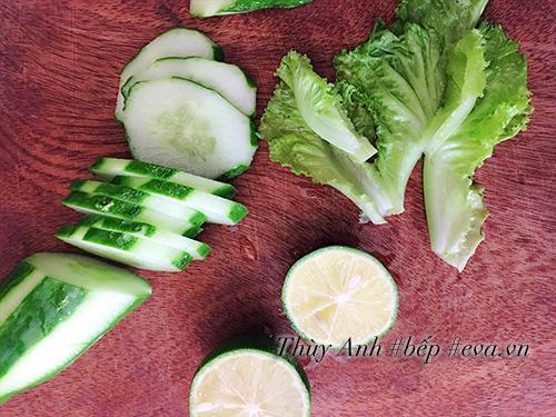 Bước 1: Các loại rau, dưa đem rửa sạch. Dưa leo gọt vỏ và thái miếng mỏng, rau sống, chanh, ớt cắt miếng.