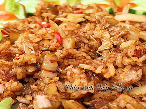 Bước 3: Cho cơm vào chào nóng có dầu, đảo cho cơm se mặt và cho xì dầu vào. Tiếp sau đó, cho kim chi thái mỏng vào đảo cùng, đảo đều tay đến khi kim chi hoà quyện cùng cơm (chiên cơm mềm hay giòn tuỳ vào sở thích để điều chỉnh).