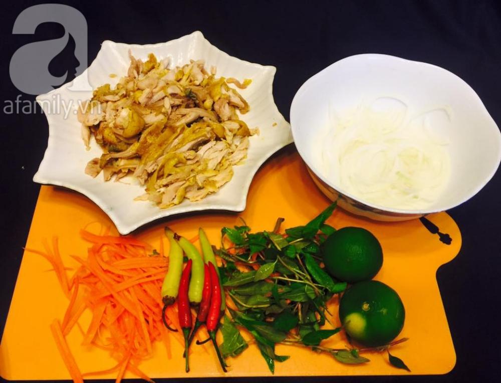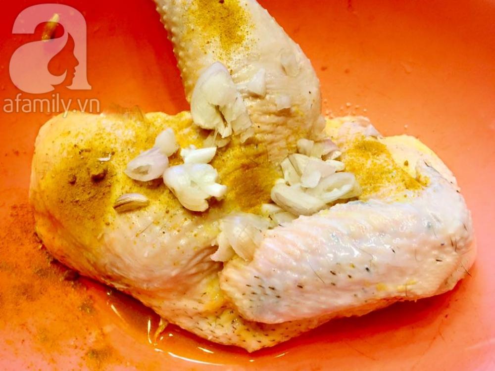 Bước 1: Gà đem rửa sạch với muối và gừng sau đó đem ướp với bột nghệ, gia vị và hành khô rồi luộc chín.