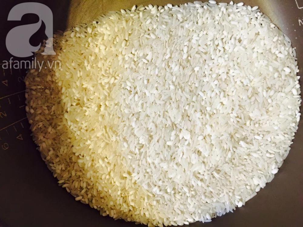 Bước 2: Gạo vo sạch ngâm nước trong vòng 1 đến 2 tiếng. Sử dụng nước luộc gà nấu cơm, lượng nước dùng để nấu cơm sao cho ngập gạo là đủ, thêm 1 muỗng cà phê bột canh.