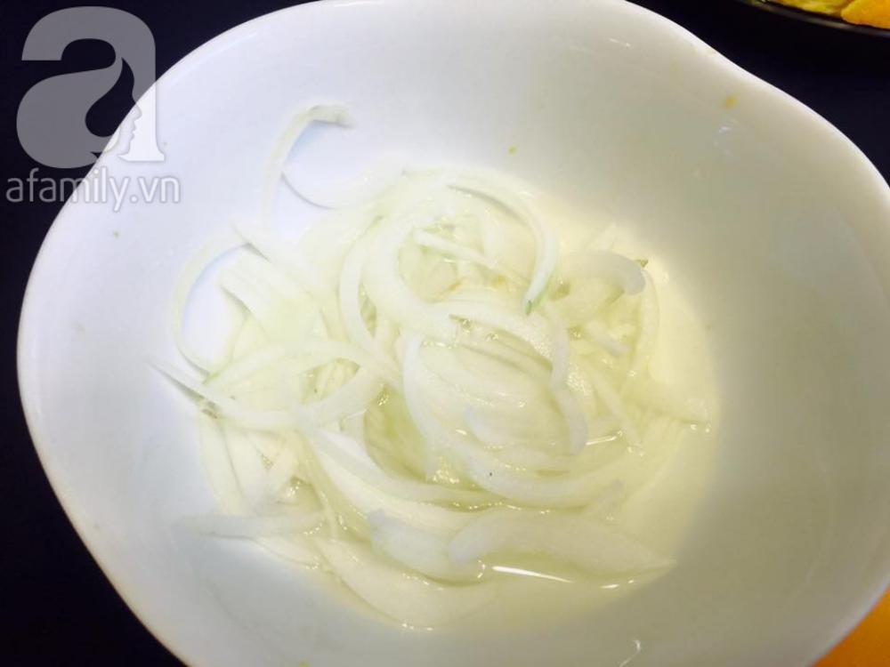 Bước 3: Hành tây thái mỏng ngâm ngay vào tô nước đá pha thêm chút giấm để hành được giòn, trắng và không bị hăng.