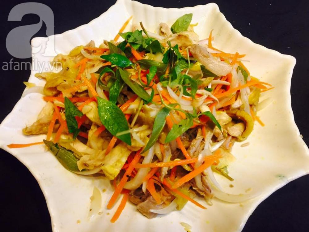 Bước 5: Cho gà vào đĩa, trộn đều cùng bột canh, hạt tiêu, bột ngọt, 1 quả ớt thái lát, nước cốt chanh sao cho nổi vị chua mặn ngọt. Cho hành tây và rau răm vào cùng thịt gà, đảo đều.