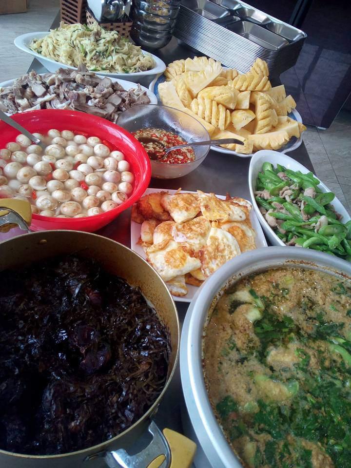 Lòng lợn hấp, thịt ba chỉ kho tàu trứng cút, vịt luộc, đậu phụ rán, đậu que luộc, canh rau