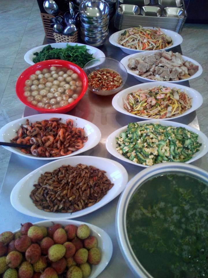 Mướp đắng xào trứng, nhộng rang lá chanh, thịt lợn luộc, tôm rim, canh mống tơi, cà pháo, gỏi, rau luộc, tráng miệng quả vải.