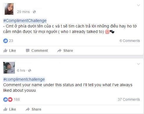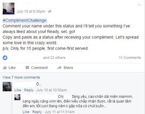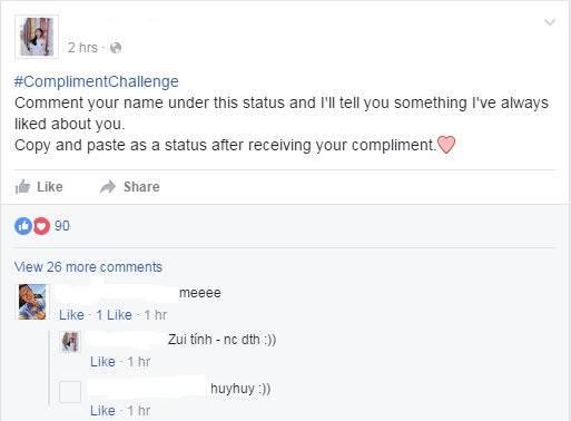 Bạn Hạnh Ngân cho biết: " Mình có thấy trò này trên facebook và mình đã để lại rất nhiều comment đấy. Có những bình luận ngẫu nhiên lắm. Dù là một người bạn thân thiết hay chỉ là người mình vừa tình cờ quen biết, chỉ cần một lời khen đơn giản, mình nghĩ có thể thay đổi một ngày của họ rồi. Thần kỳ lắm đấy và mình cũng thấy vui lây.
