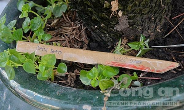 Sau khi đâm ông Đô, hung thủ vứt con dao vào chậu kiểng gần đó. Trong ảnh là con dao giả định để đối tượng gây án dựng lại hiện trường ngay trong đêm