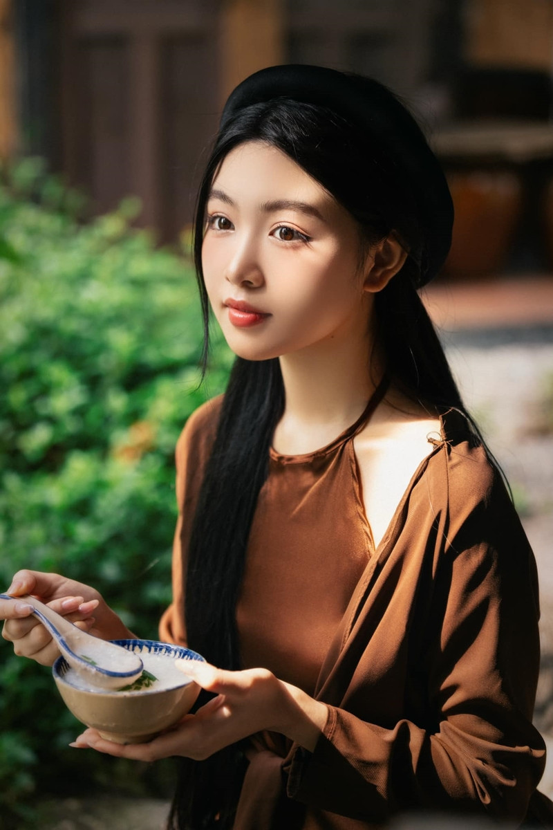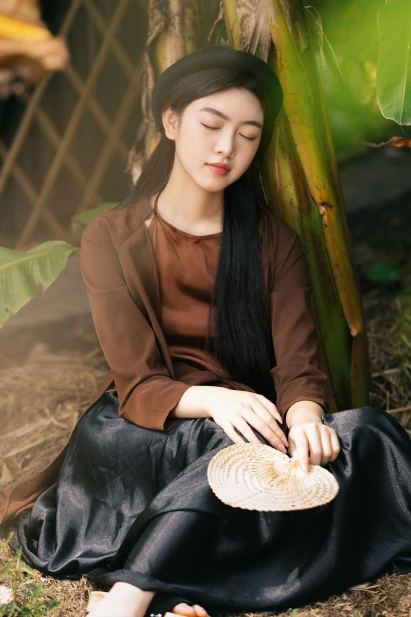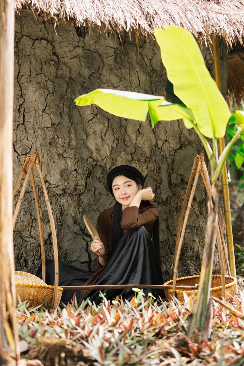 Với chiều cao trên 1,7m cùng gương mặt khả ái, Lọ Lem tỏa sáng trong những khung hình đậm chất thơ. Cô chọn áo tứ thân màu nâu trầm kết hợp yếm đào, tóc buông xõa tự nhiên, trang điểm nhẹ nhàng phù hợp với không gian làng quê yên bình.