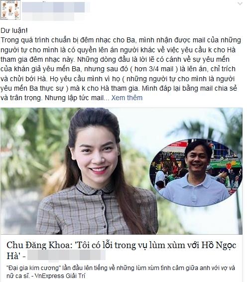 Câu chuyện ồn ào về mối tình của nữ hoàng giải trí - Hồ Ngọc Hà và đại gia kim cương Chu Đăng Khoa đang nhận được sự quan tâm đặc biệt từ dư luận. Sự việc càng lên cao trào khi vợ và người tình của Hồ Ngọc Hà cùng lên tiếng. Đặc biệt, khi vợ mình liên tục lên tiếng chỉ trích Hồ Ngọc Hà thì đại gia Chu Đăng Khoa lại nói lời xin lỗi nữ ca sỹ. Vì lẽ đó, Hồ Ngọc Hà đã phải nhận vô số "gạch đá" từ dư luận và để tránh ồn ào nữ ca sỹ đã phải tạm thời đóng cửa trang cá nhân.