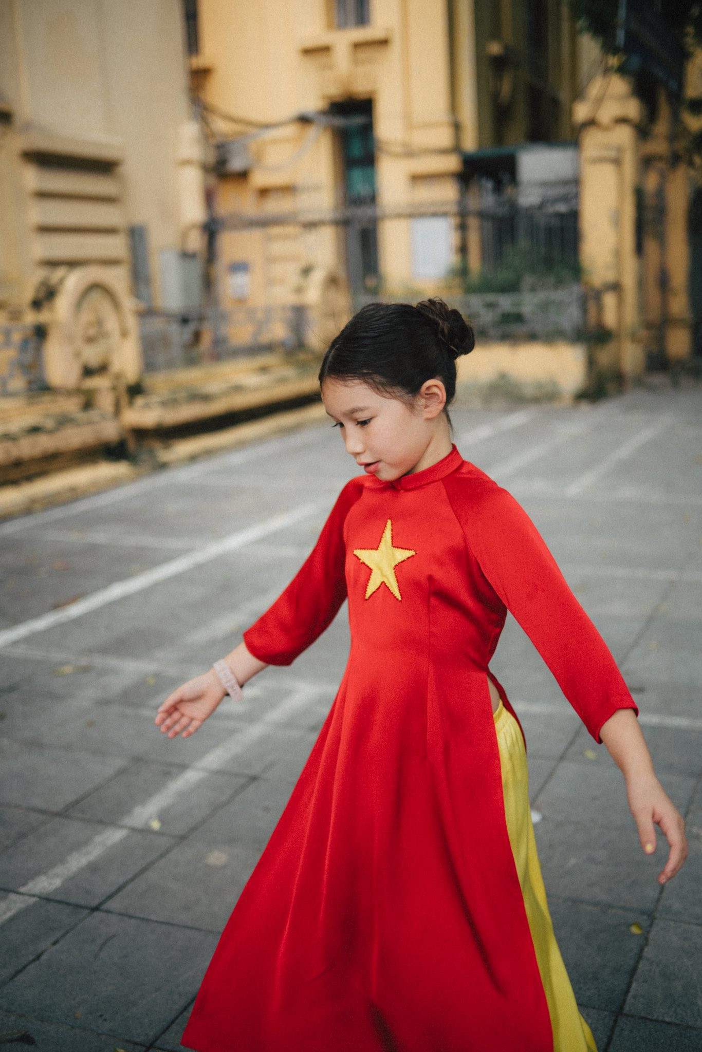 Bé Myla - con gái lai Tây của siêu mẫu Hà Anh rất hân hoan khi được diện trang phục áo dài cờ đỏ sao vàng.