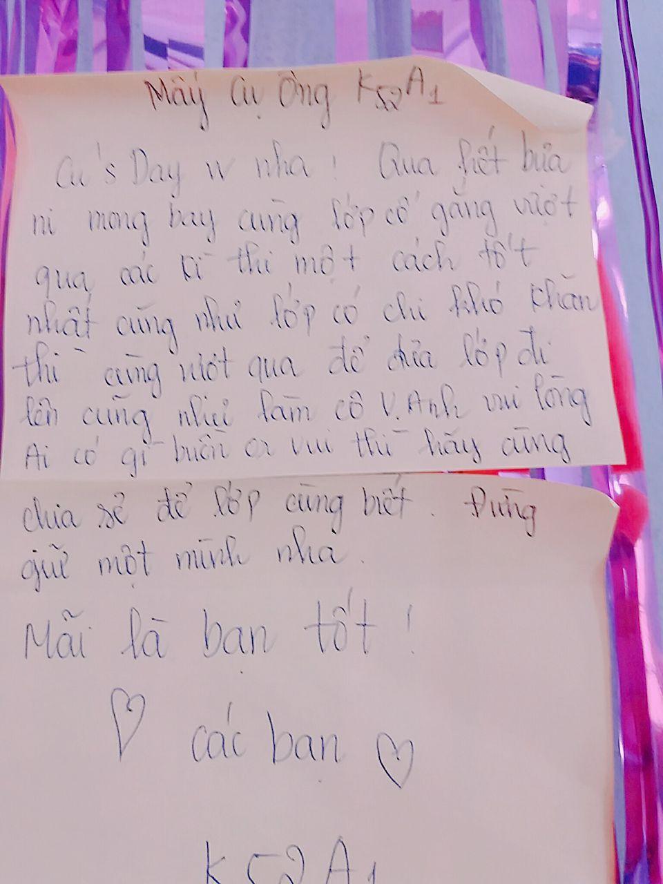 "Công nhận là con gái lớp mình khéo tay mà sáng tạo quá. Trang trí lớp đẹp mà ý nghĩa. Tâm thư viết làm mình cảm động rơi nước mắt luôn. Lại kiếm đâu ra lắm ảnh thế không biết, mà toàn ảnh chất thôi. Bánh thì hồng đúng chất con... trai (miễn cưỡng quá). Nói chung là vui và hạnh phúc lắm. Cảm ơn toàn thể mấy anh con gái của lớp đã cho tụi phụ nam một ngày thật vui vẻ và ý nghĩa", một bạn trai trong lớp nói.