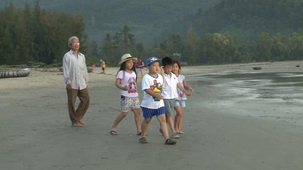 Cả bốn bạn nhỏ nhanh chóng làm quen và thả hồn theo câu chuyện “Cá Ông” của người khách lạ.