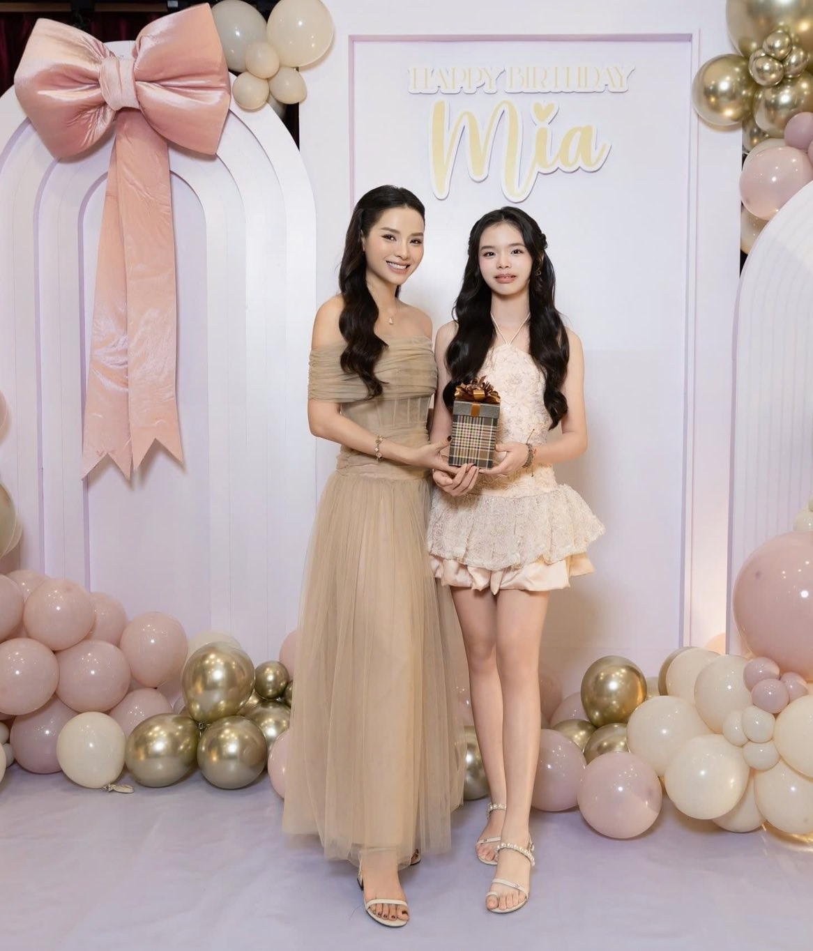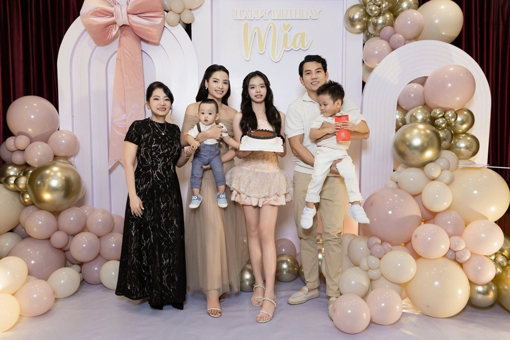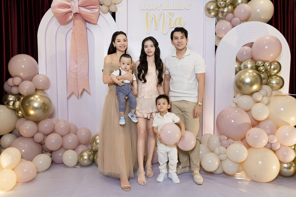 Chủ nhân bữa tiệc - công chúa Mia diện váy ngắn tông màu be đồng điệu với mẹ Phương Trinh Jolie.