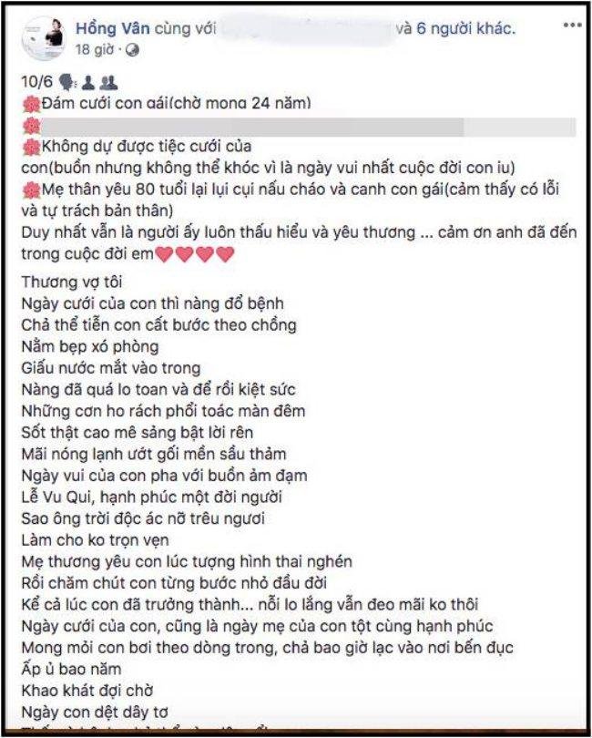 Kết thúc ngày vui của con gái, NSND Hồng Vân đã đăng tải một bức tâm thư khá dài, chia sẻ cảm xúc khi không có mặt tại buổi hôn lễ. Theo bà xã của diễn viên Lê Tuấn Anh, sau 24 năm chờ mong, cô con gái mà nghệ sĩ hết mực yêu thương đã tìm được bến đỗ. Tuy nhiên, cô lại cảm thấy buồn vì không thể có mặt trong đám cưới.
