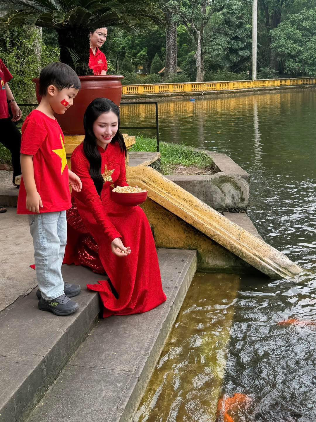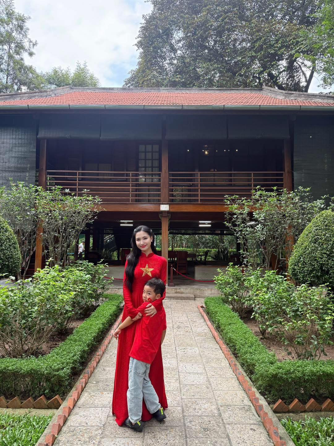 Trong hình, Hòa Minzy diện áo dài đỏ truyền thống còn bé Bo cũng diện áo cờ đỏ sao vàng thể hiện tinh thần yêu nước.