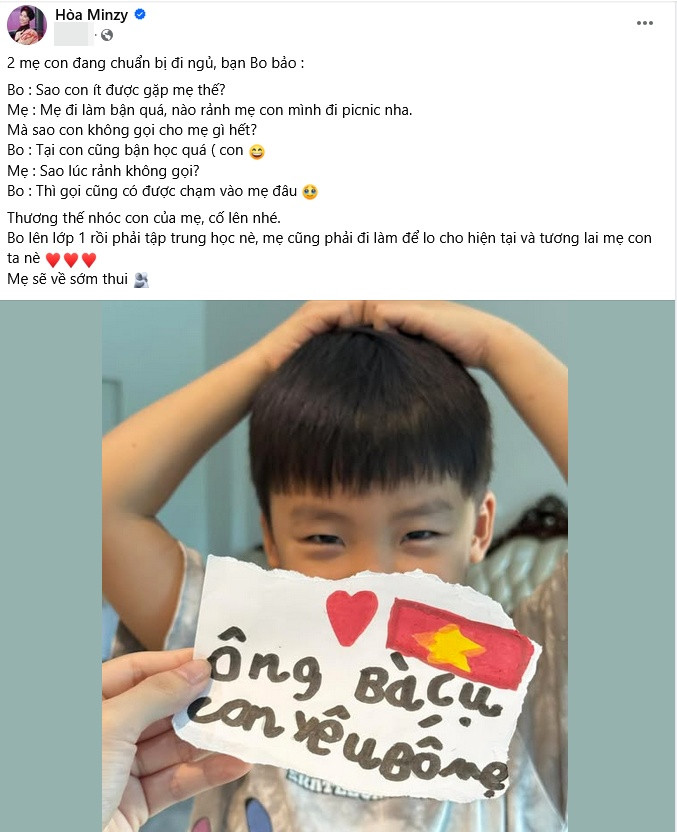 Mới đây, Hòa Minzy chia sẻ đoạn hội thoại với con trai trên trang cá nhân gây chú ý.