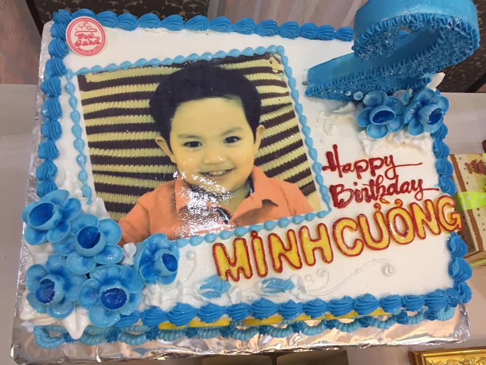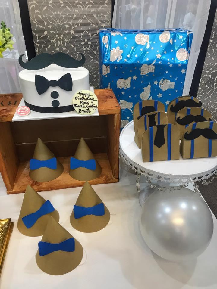 Không gian tiệc được vợ chồng Hiển - Thi trang hoàng sang trọng nhã nhặn với gam màu xanh chủ đạo. Ngoài hoa và bóng bay, bàn tiệc của bé Bi được trưng bày bánh, nước uống... với các hình thù dễ thương. Đặc biệt, chiếc bánh sinh nhật được trang trí tỉ mỉ với viền xanh, bên trên có in hình KuBi cùng dòng chữ: "Happy birthday Minh Cường".