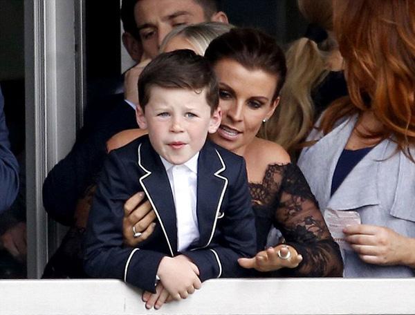 Coleen mặc bộ váy xanh navy vai trần gợi cảm nhưng mọi sự chú ý dường như đổ dồn về gương mặt sáng sủa, lém lỉnh giống Rooney như đúc của cậu con trai Kai.