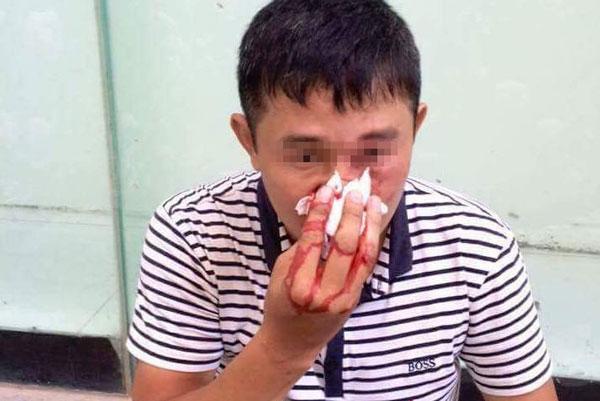 Nạn nhân Hạnh ngồi ôm mũi đang bị chảy máu