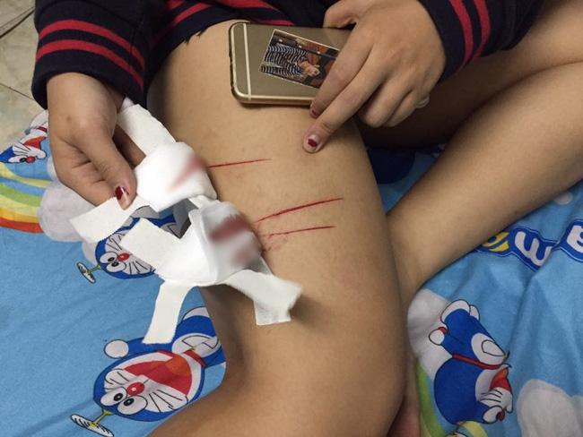 Bên đùi phải của cô gái trẻ có 3 nhát lưỡi lam rướm máu. Ảnh: Facebook G.H.