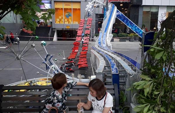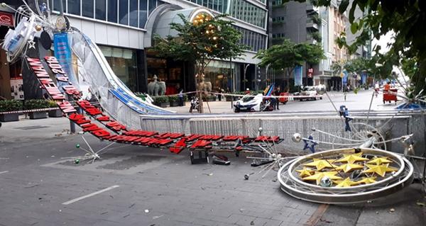 Lúc này, anh Nguyễn Văn Hiếu, 21 tuổi, ngụ phường Tân Định, quận 1, đi ngang qua nên bị các khung sắt đè trúng, dẫn đến bị thương. Nhiều người dân đang vui chơi trên phố đi bộ hốt hoảng tháo chạy.