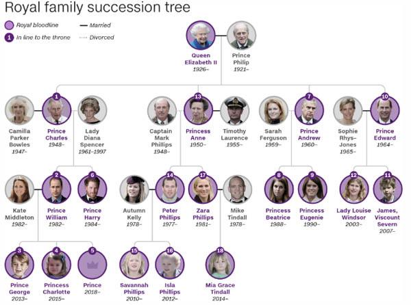 Cây gia phả thể hiện thứ tự thừa kế ngai vàng, sau khi em bé thứ ba của William - Kate chào đời. Đồ họa: CNN.