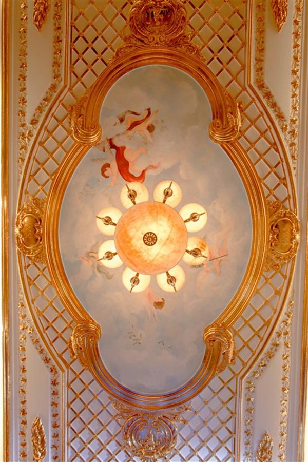 Trần nhà được dát vàng cầu kỳ, và trang trí bởi hệ thống đèn sang trọng.