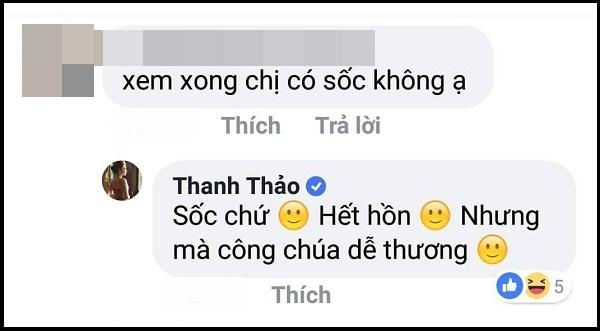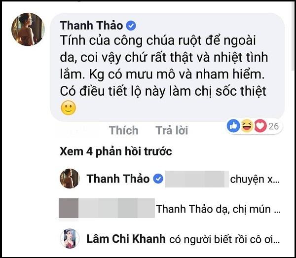 Ngay sau khi Lâm Khánh Chi công khai chuyện "thâm cung bí sử", cư dân mạng lại đổ dồn sự chú ý sang Thanh Thảo và chờ đợi phản ứng của cô. Trả lời người hâm mộ trên mạng xã hội, "búp bê" thừa nhận bị "sốc, hết hồn" khi nghe talkshow của "công chúa".