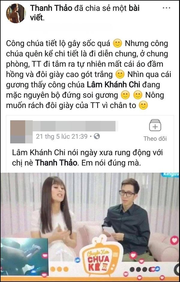 Không chỉ vậy, nữ ca sĩ còn nhắc khéo chi tiết mà Lâm Khánh Chi còn kể thiếu trong talkshow. Có lẽ do vô tình hoặc ái ngại nên "công chúa" không nhắc tới chuyện mặc trộm đầm của Thanh Thảo thời chưa chuyển giới.