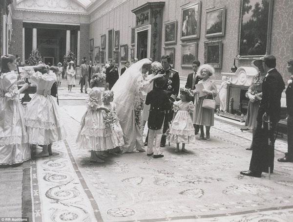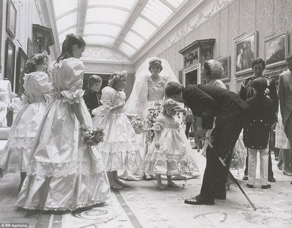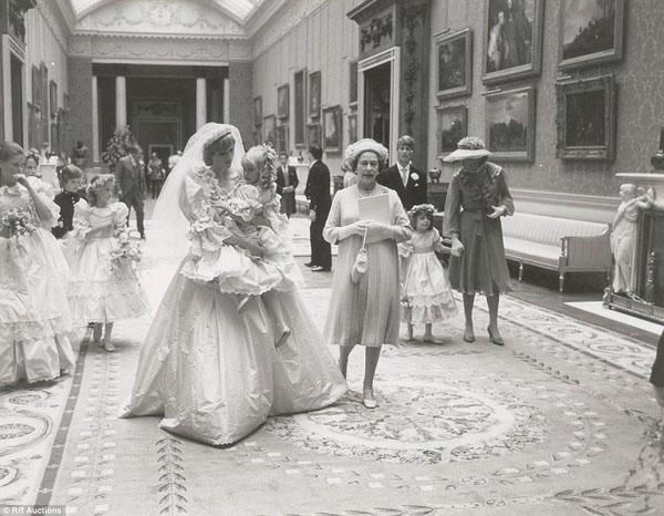 Bức ảnh chụp Công nương Diana trong chiếc váy cưới sang trọng đang bế cô bé phù dâu 5 tuổi Clementine Hambro khi ở trong điện Buckingham Palace. Bên cạnh Diana là nữ hoàng Elizabeth II, người chỉ vài phút sau sẽ trở thành mẹ chồng khi cô chính thức thành thân với Thái tử Charles
