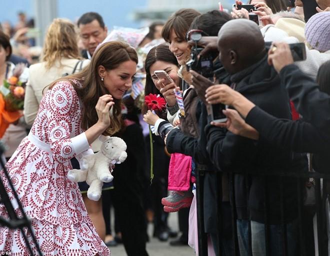 Công nương cúi người nhận món quà do người dân gửi tặng. Cô luôn nở nụ cười rạng rỡ trên môi.