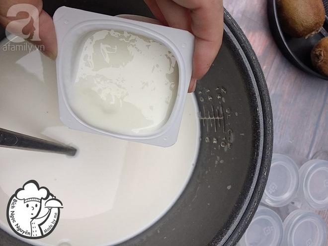 Cho 2 hộp sữa chua vào nồi sữa khuấy đều rồi đổ hỗn hợp trên vào nồi cơm điện.