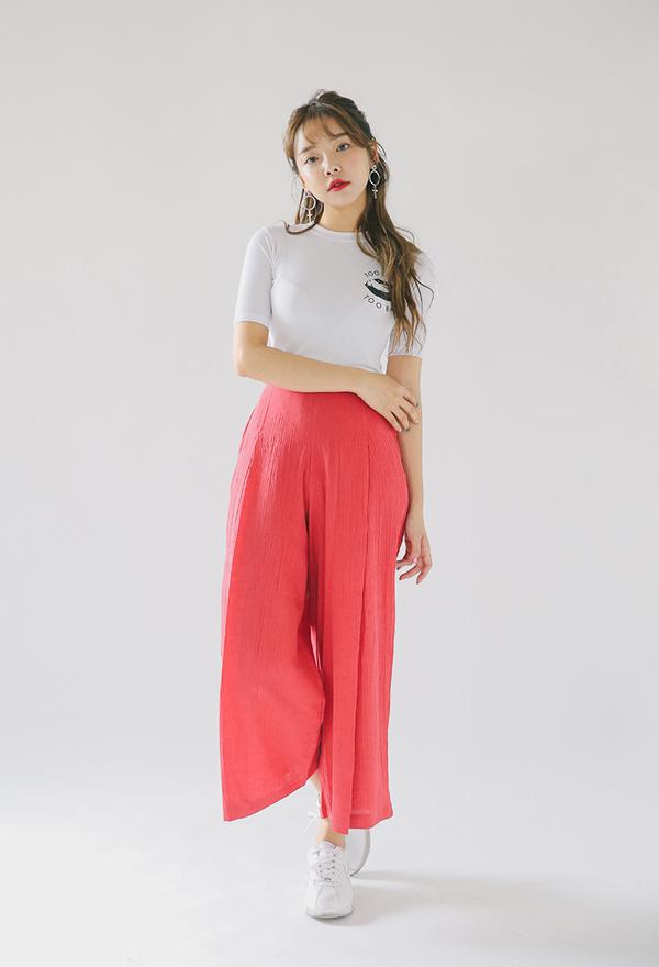 Áo phông trắng ôm sát người kết hợp với quần culottes đỏ và giày sneaker trắng