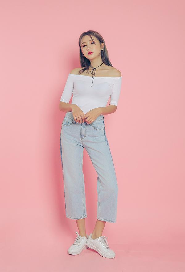 Nếu bạn muốn tìm một item mix với quần jeans dáng lửng thì áo phông trắng trễ vai