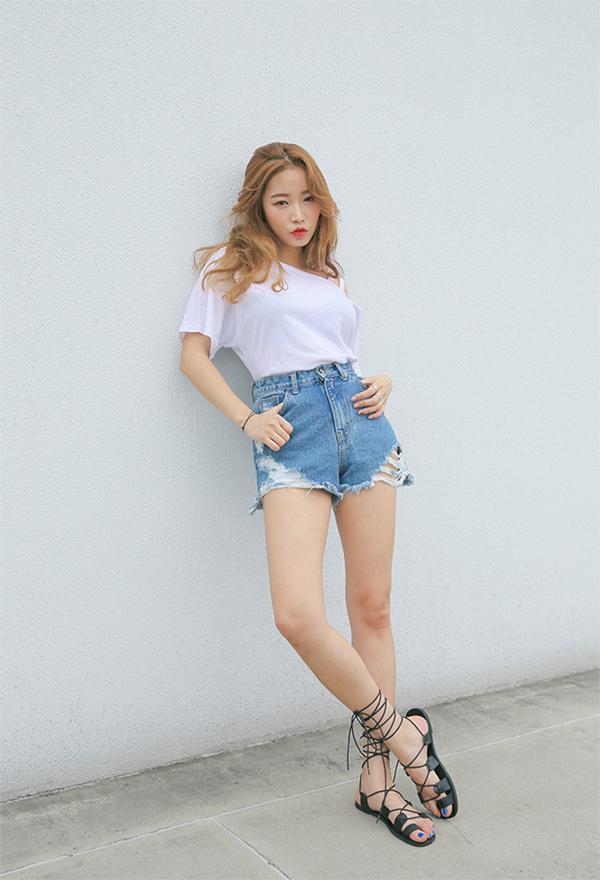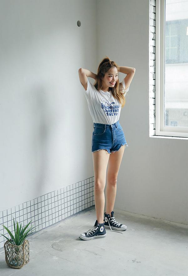 Áo phông trắng + quần shorts gấu "nham nhở" sẽ rất cá tính. Bạn nên nhấn nhá thêm với