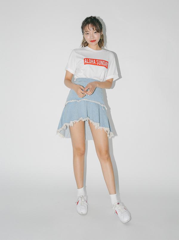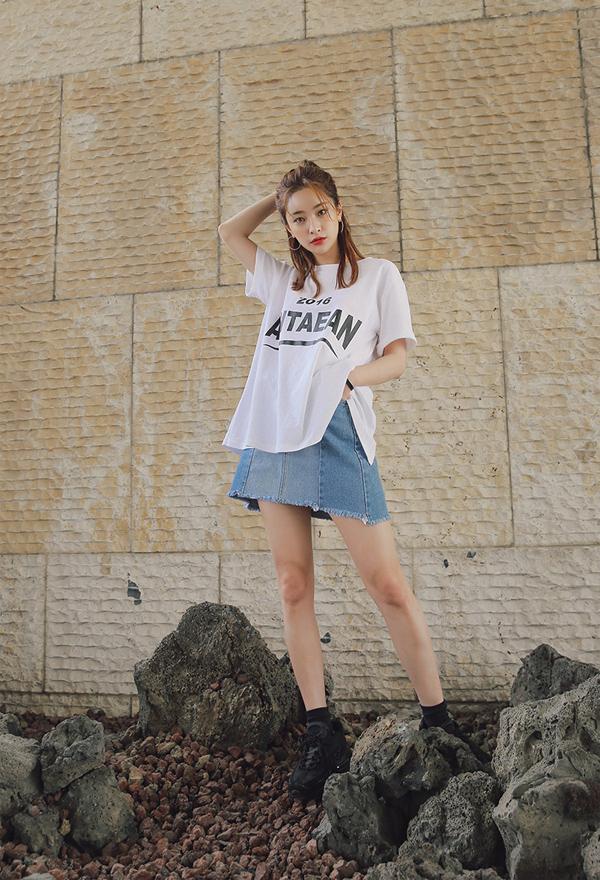 Trong khi đó, áo phông trắng oversized kết hợp chân váy mini denim sẽ khơi
