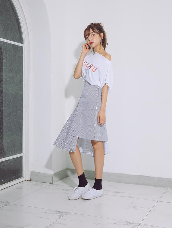 Một chiếc áo phông trắng trễ vai đi cùng chân váy vạt lệch, giày sneaker buộc