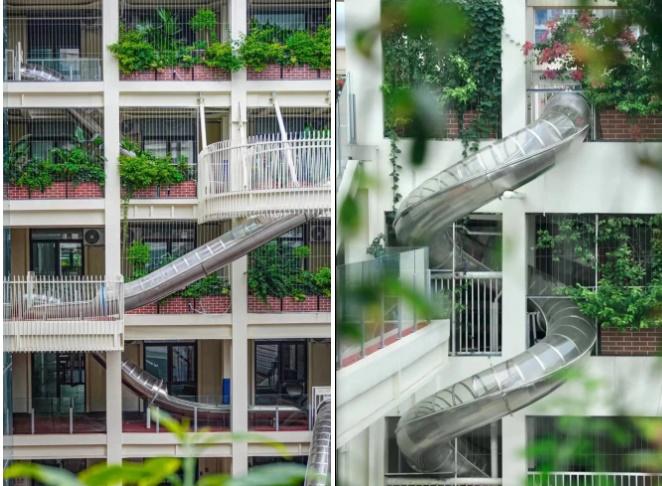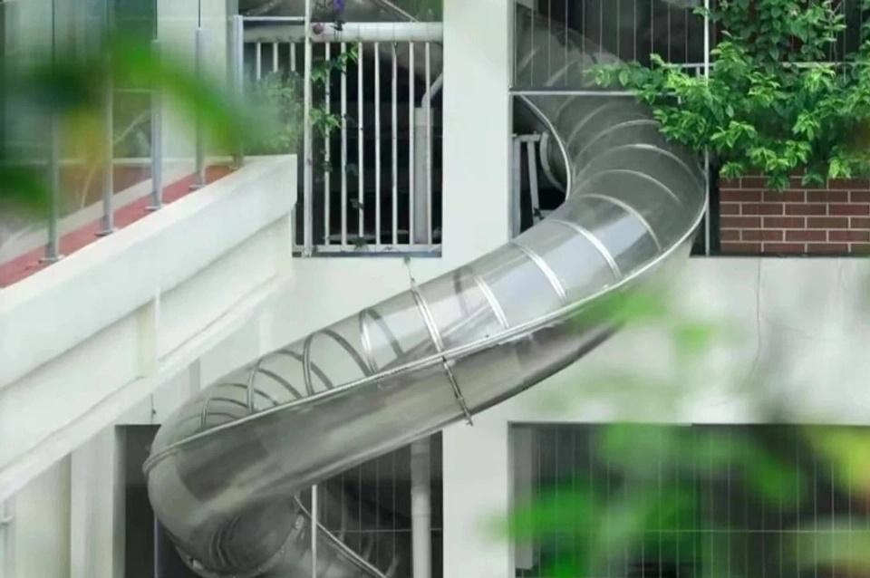 Những chiếc cầu trượt được sắp xếp đan chéo nhau trong toàn bộ tòa nhà để mọi người có thể di chuyển xuống từ tầng của mình.