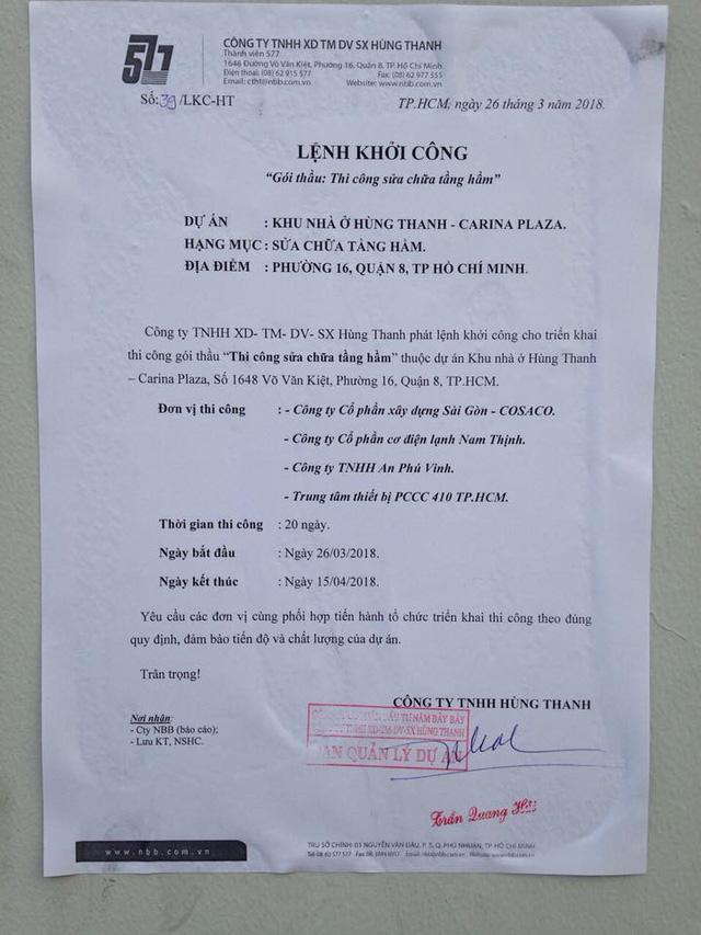 Trước đó, ngày 28/3, cư dân nhận được thông báo dán tại tầng trệt Block C chung cư Carina có nội dung: Công ty TNHH XD TM DV SX Hùng Thanh phát lệnh khởi công cho triển khai thi công gói thầu “Thi công sửa chữa tầng hầm” thuộc dự án Khu nhà ở Hùng Thanh – Carina Plaza. Thời gian thi công 20 ngày.