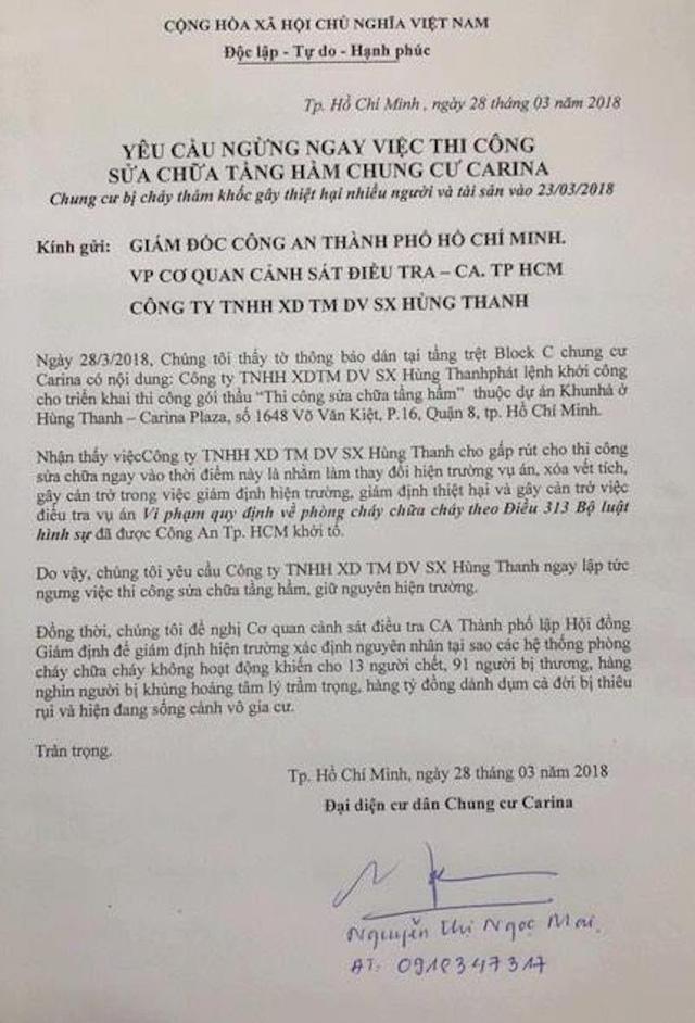 Cư dân cũng đề nghị Cơ quan cảnh sát điều tra Công an TP HCM lập Hội đồng Giám định để giám định hiện trường xác định nguyên nhân tại sao các hệ thống phòng cháy chữa cháy không hoạt động.