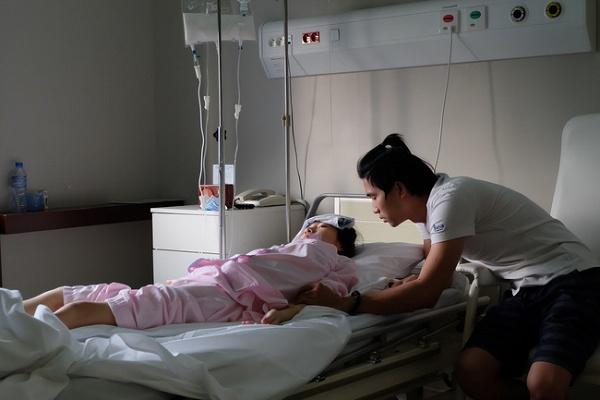 Lê Kỳ dịu dàng nắm tay bạn gái trong phòng bệnh.