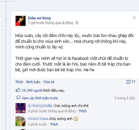 Đinh Tiến Dũng - anh chàng bất ngờ nổi tiếng cùng nhân vật "giáo sư Cù Trọng Xoay" trong chương trình Hỏi xoáy đáp xoay vốn là người khá kín tiếng trong chuyện tình cảm. Tuy nhiên, mới đây, trên một trang mạng xã hội được cho là của giáo sư Xoay "xịn" bất ngờ chia sẻ: "Mùa xuân, cây cối đâm chồi nảy lộc, muôn loài tìm nhau ghép đôi để chuẩn bị cho mùa sinh sản... Hòa chung với không khí này, mình cũng chuẩn bị lấy vợ".