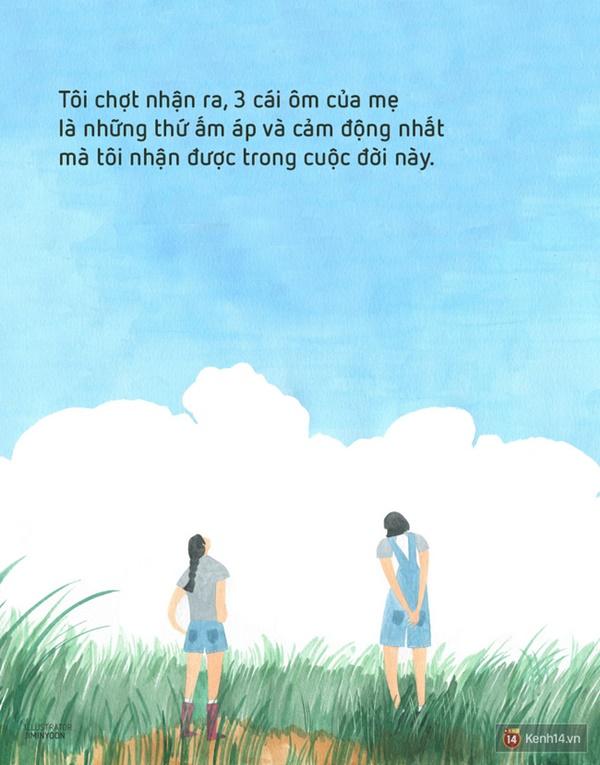 Tôi chợt nhận ra, 3 cái ôm của mẹ là những thứ ấm áp và cảm động nhất mà tôi nhận được trong cuộc đời này. Tôi chẳng dám tham lam mong ước nhiều hơn nữa, bởi tôi biết cho dù mẹ rất hiếm khi thể hiện, nhưng trong lòng bà luôn hiện hữu tình yêu thương vô bờ bến, vô điều kiện dành cho đứa con gái ngỗ ngược này…