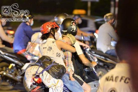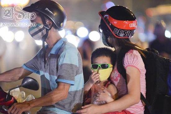 Lượng xe quá đông khiến khói bụi mù mịt kín đường, nhiều gia đình đã phải trang bị cho con em mình đầy đủ "đồ nghề" như kính mắt, khẩu trang nhưng lại thiếu... mũ bảo hiểm!